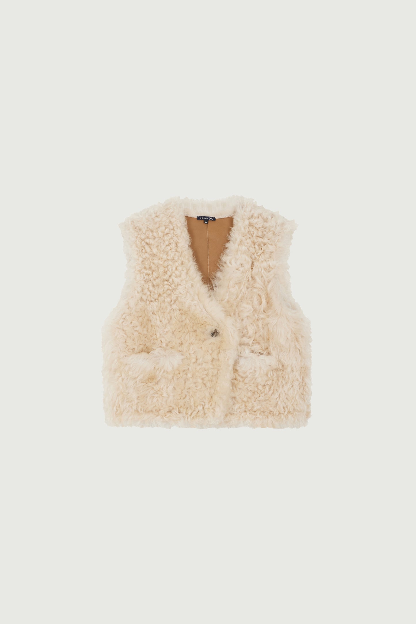 UDEN es un chaleco de piel con lana vuelta que puedes combinar como desees o llevar bajo un abrigo amplio. Su lana rizada es especialmente cálida. Su diseño recto es ajustable gracias a un botón cruzado que permite llevarlo a modo de foulard cruzado. Cuenta con bolsillos ocultos en la parte delantera.