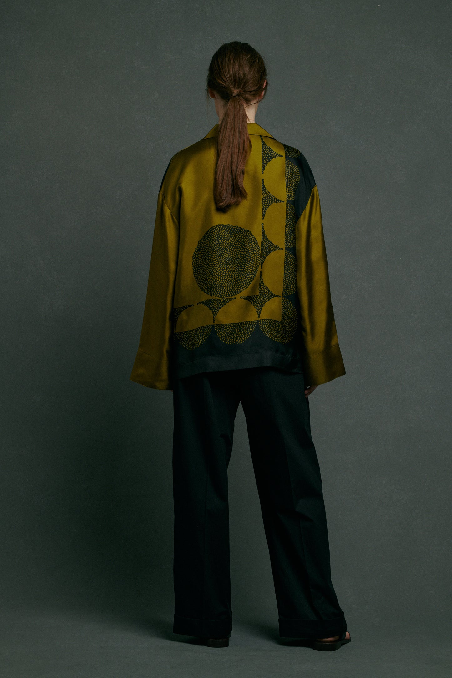 Camisa amplia de sarga de seda estampada «Pochoir» caqui