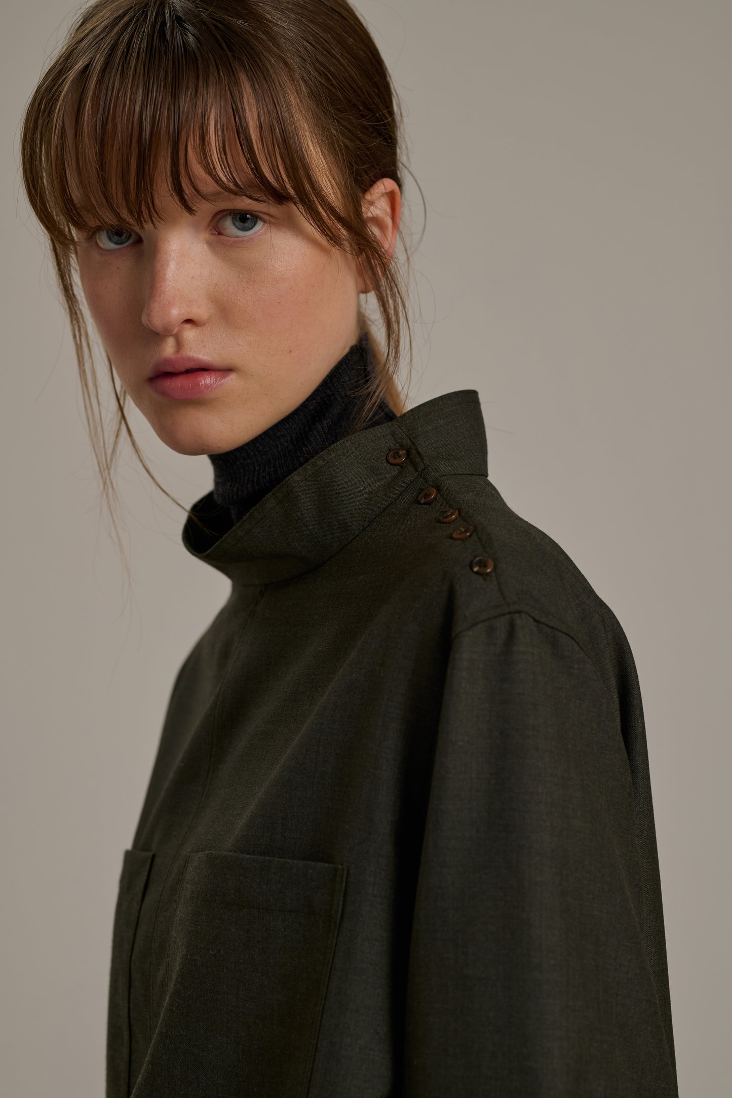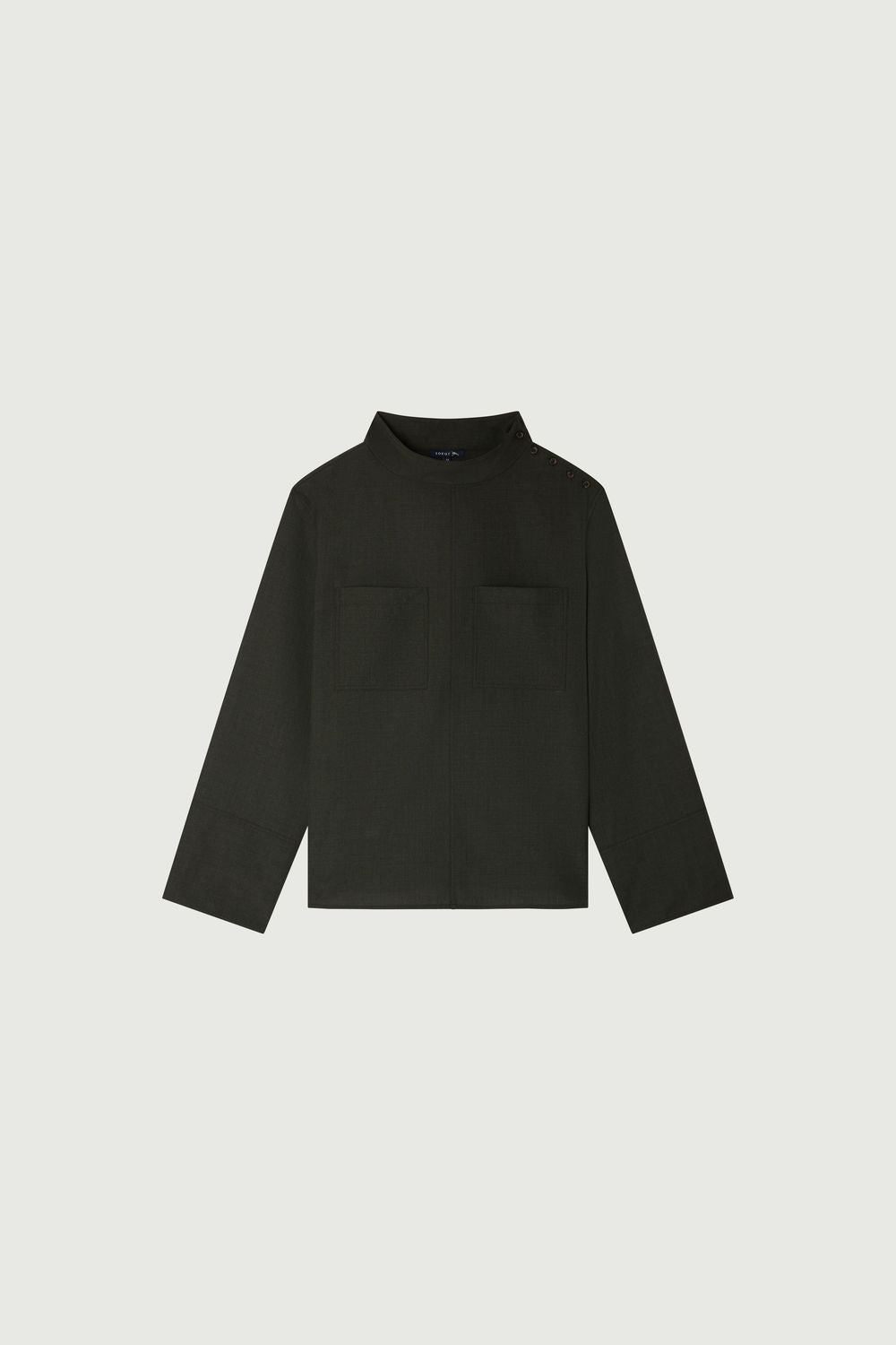 CANNES es una blusa de algodón y lana. Con su corte recto y sus mangas muy largas, y su cuello chaminé alejado del cuello, ofrece un estilo elegante y cómodo.