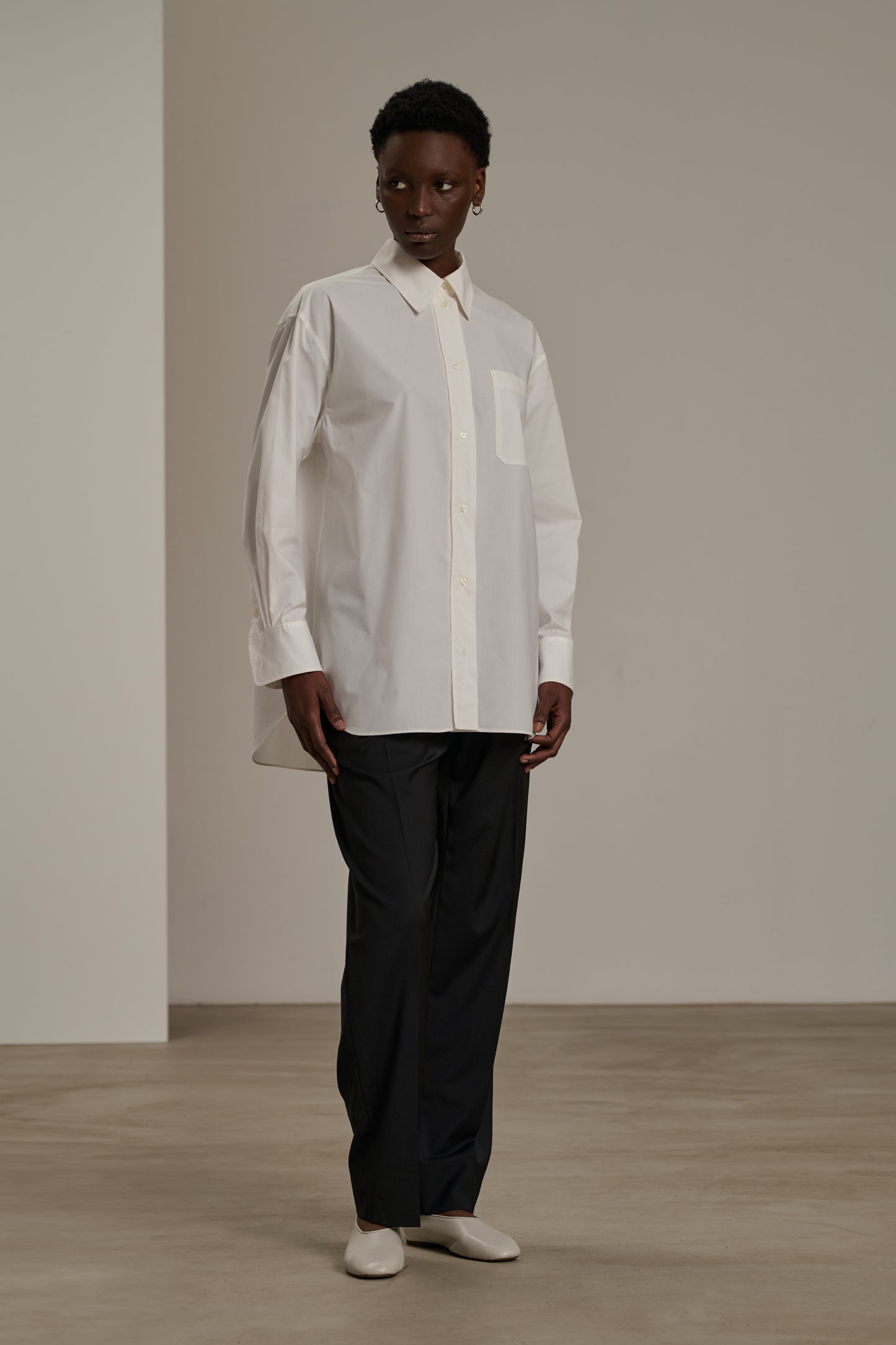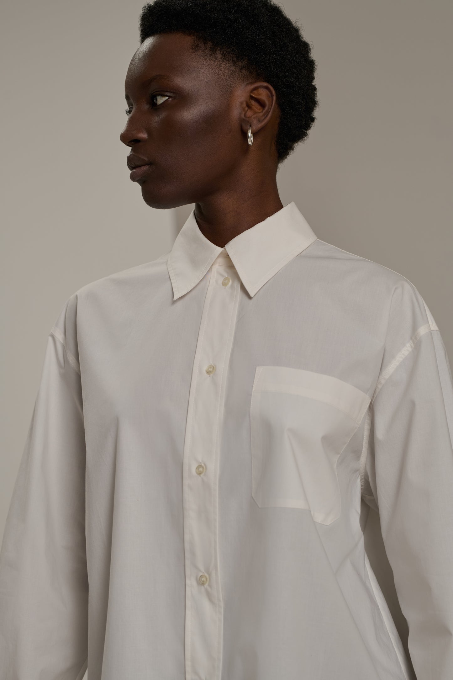 CARLOTTA es una camisa de popelina blanco roto que apuesta por un corte oversize inspirado en el armario masculino, para un estilo desenfadado y elegante.