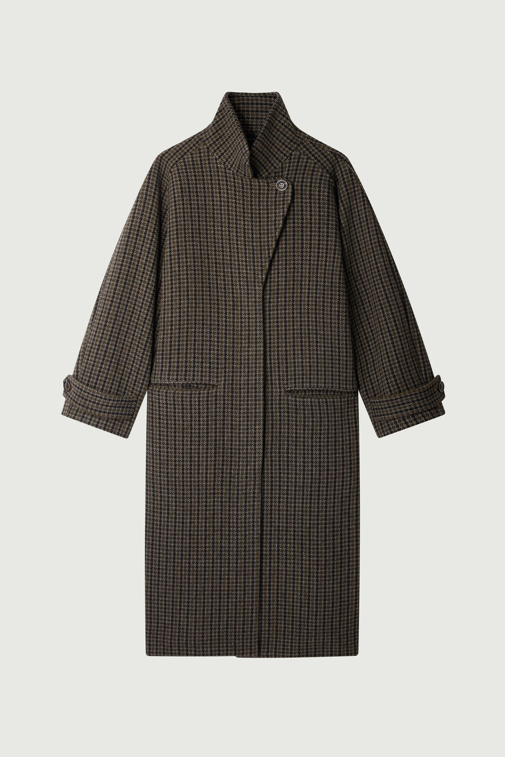 OSCAR es un abrigo largo de tweed de lana a cuadros. Cuenta con mangas raglán para un confort óptimo y un cuello versátil que puede llevarse abierto o cerrado. La apertura con solapa de botones oculta asegura un acabado elegante, mientras que los dos bolsillos ribeteados en la parte delantera añaden un toque práctico y sofisticado.
