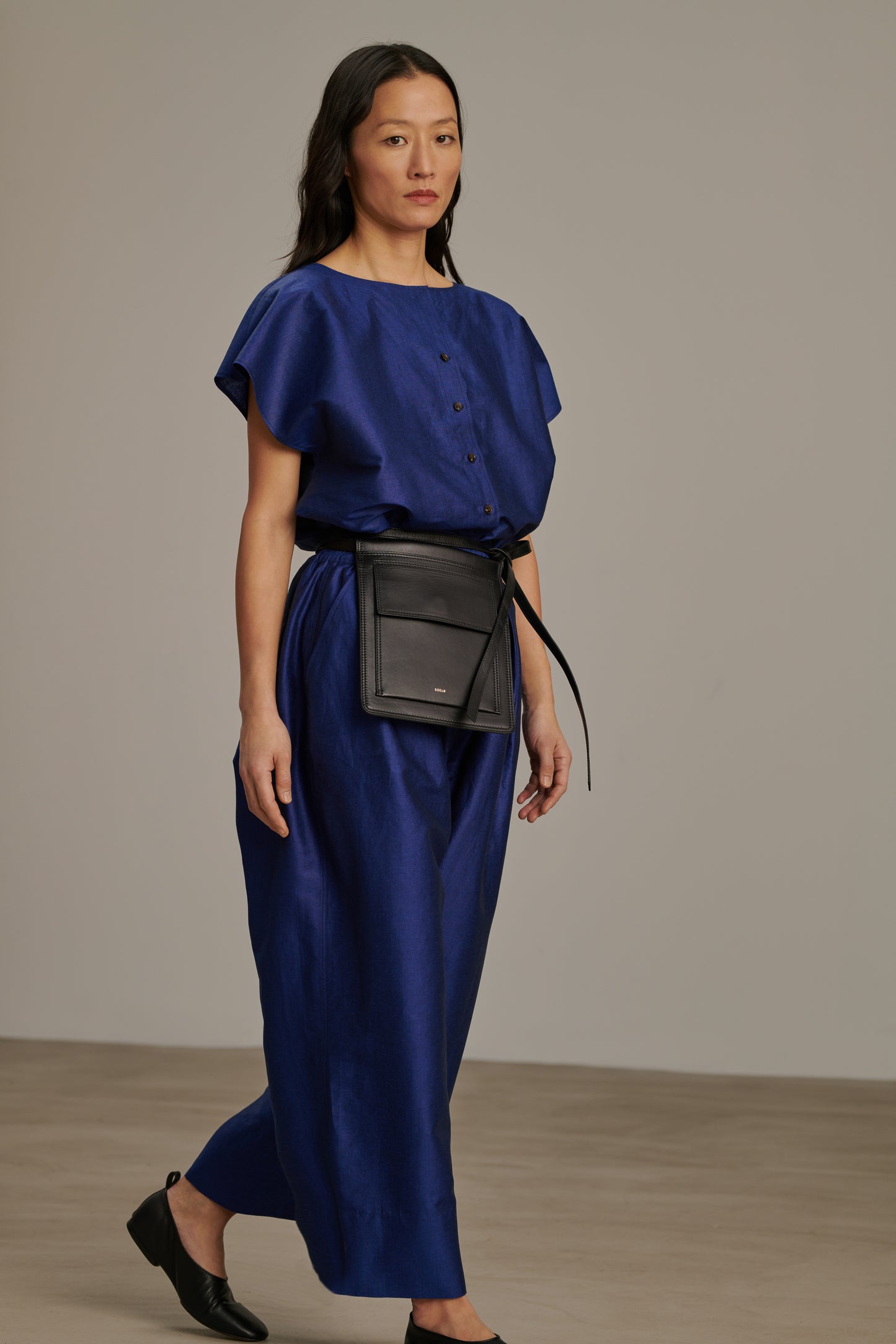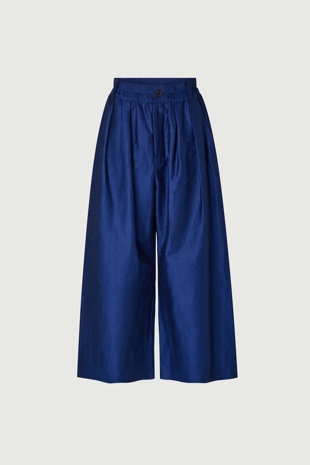 CAMERON es un pantalón amplio, con la pierna redondeada. Su material es un algodón-lino chintz, un tejido elegante y ligeramente brillante.