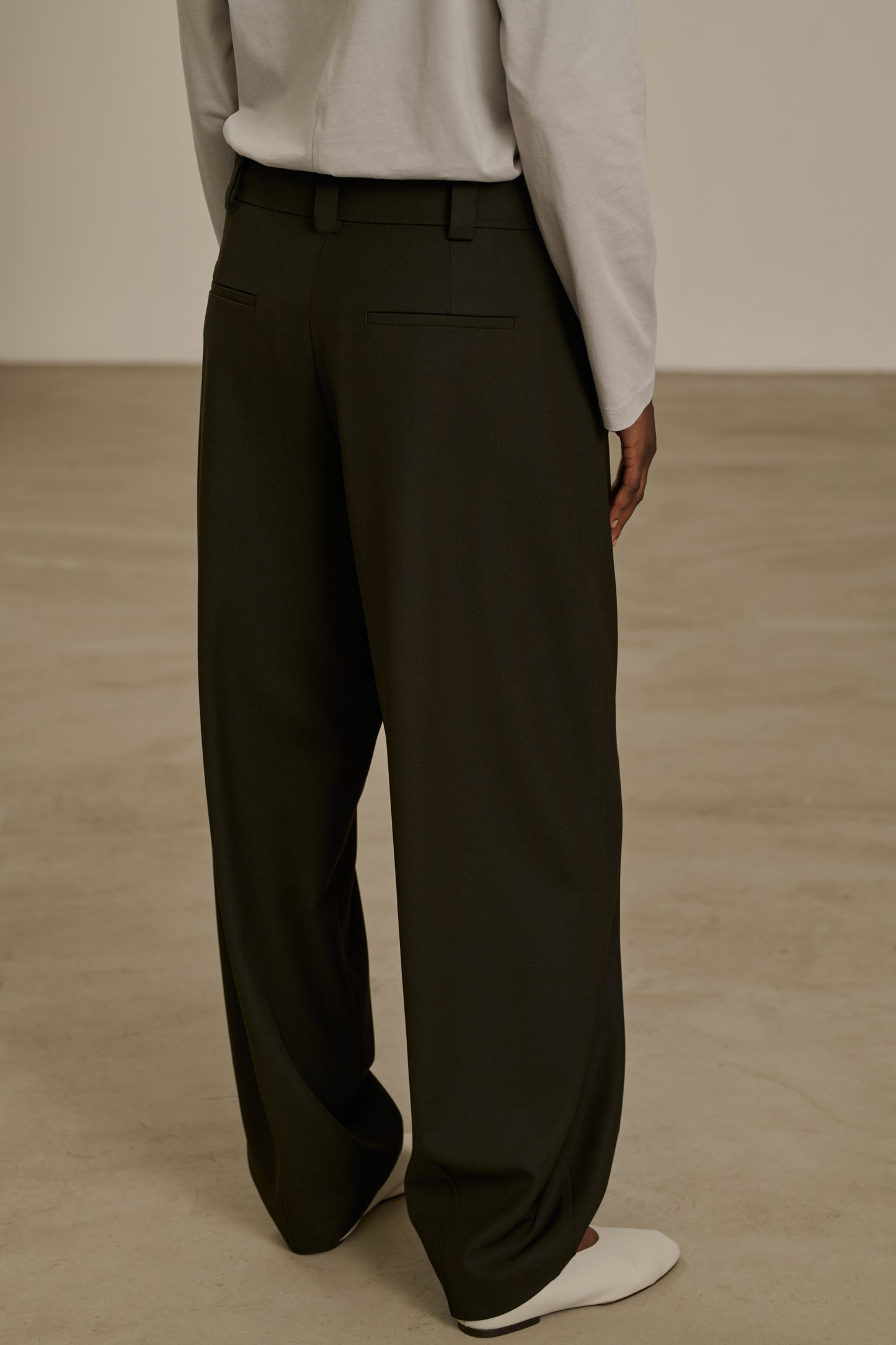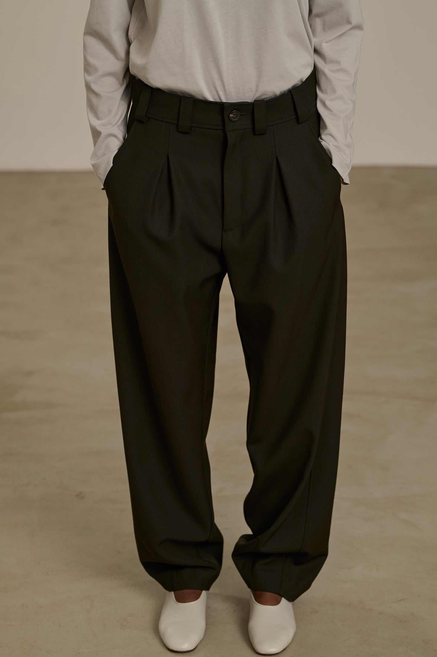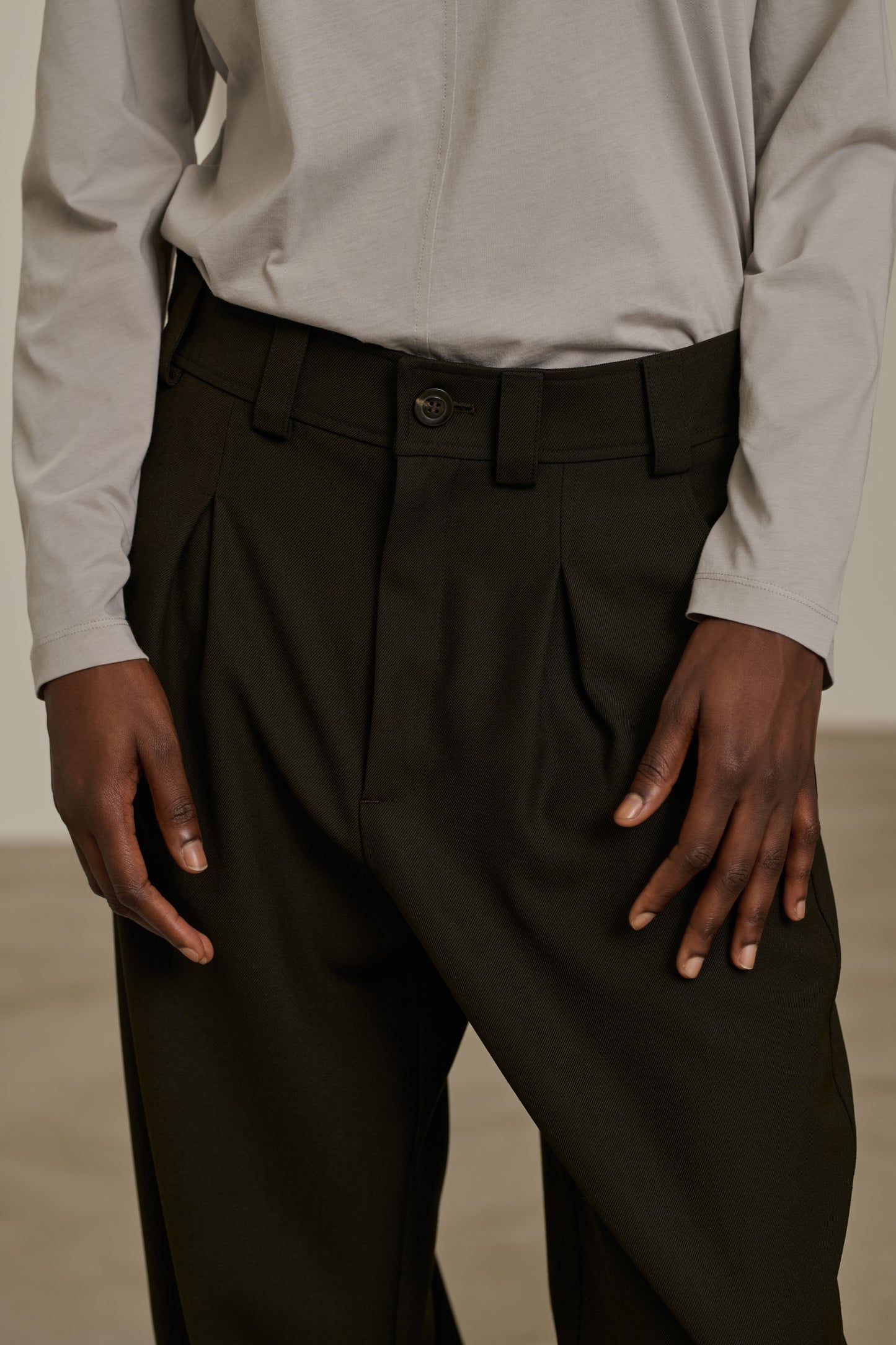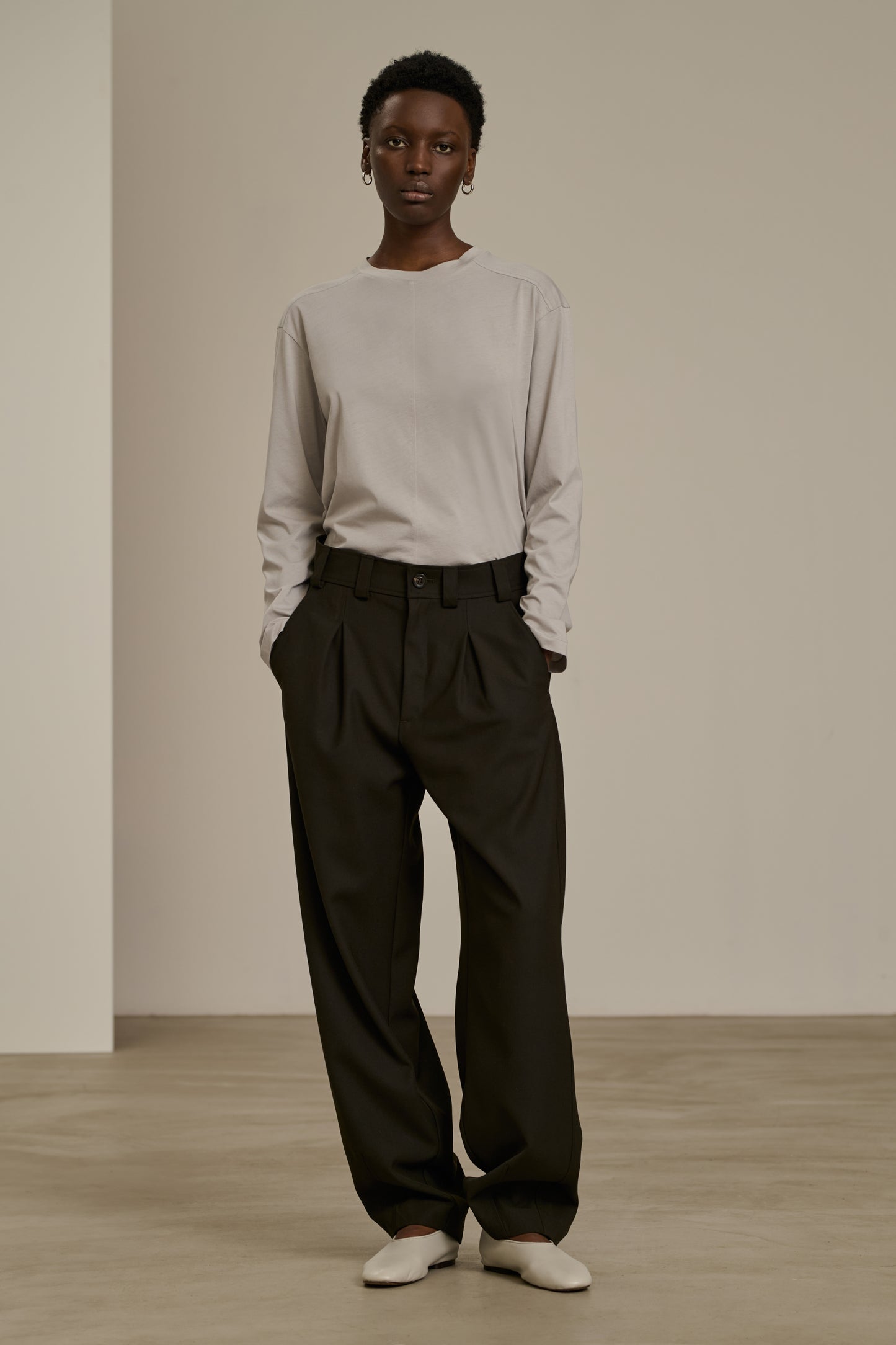 TIMON es un pantalón con pinzas para llevar a cintura alta, con cinturón y blusón, o a cintura baja sobre las caderas. Crea un efecto de volumen controlado, ideal para un vestuario oversize. Combinar con el pantalón TIMON para un total look otoñal en gabardina de lana.