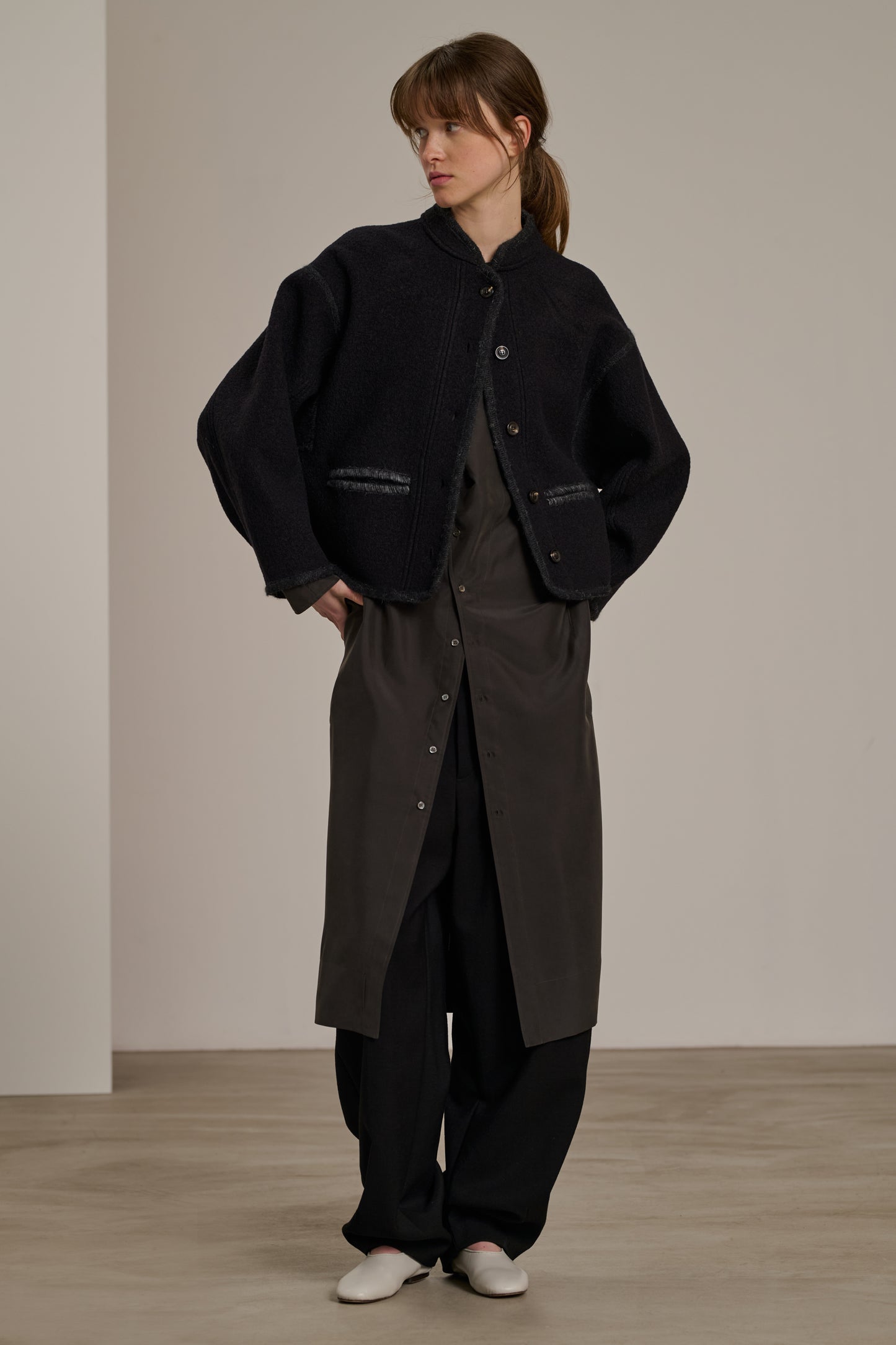 OLYMPE es una chaqueta de lana gruesa, con un volumen corto que queda elegantemente suspendido por encima de la cintura. Combina tanto con un pantalón de traje como con unos vaqueros informales, ofreciendo una versatilidad que realzará todos tus conjuntos.